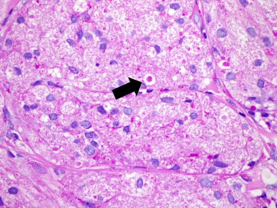 These are PAS positive lysosomal inclusions surrounded by a clear halo in Granular Cell Tumors