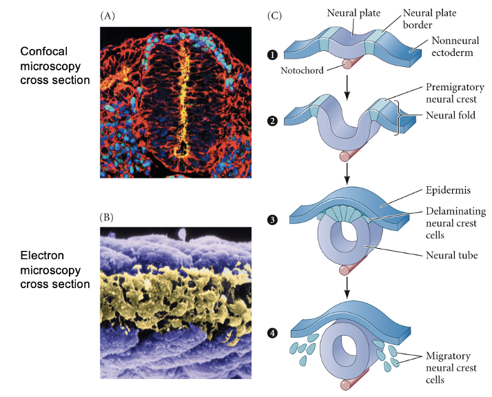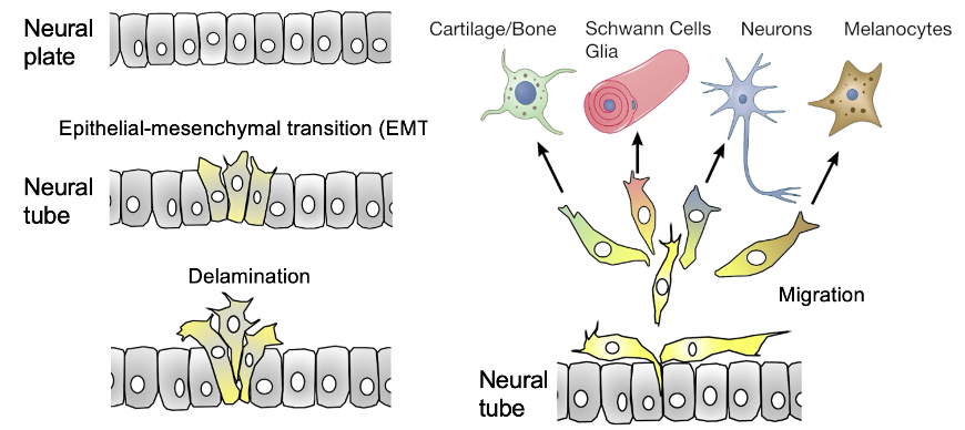 (A) Neural crest cells undergo an epithelial-to-mesenchymal transition from the dorsal most portion of the neural tube