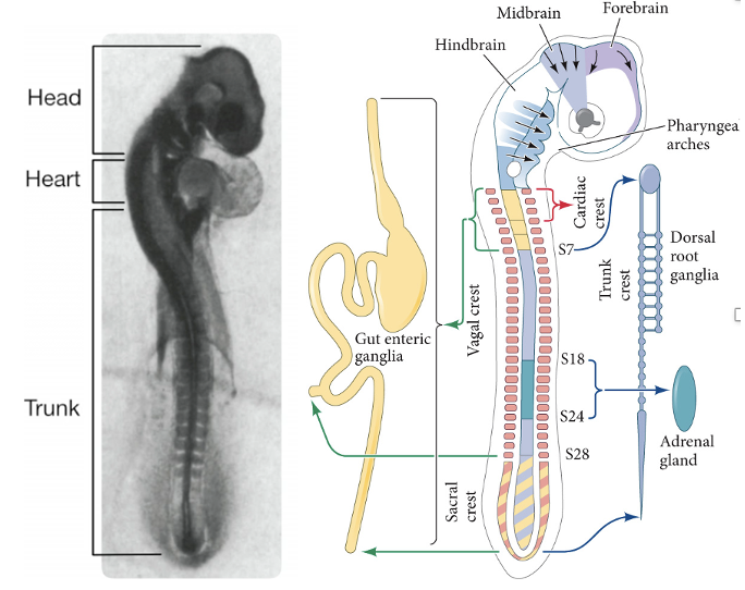 and a subset of them (at the level of somite’s 18-24) forms the medulla portion of the adrenal gland (this gland sits on top of kidney and is involved in many endocrine functions such as the release of adrenaline)