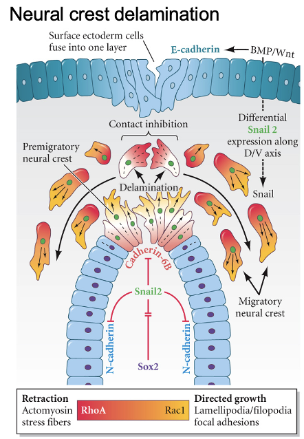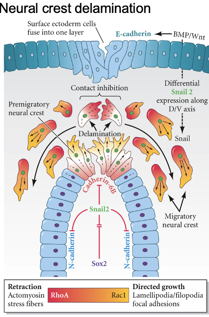 High levels of BMP, and intermediate amounts of Wnt (both epidermal) upregulate expression of Snail-2 (and Zeb-2) in the premigratory neural crest cells
