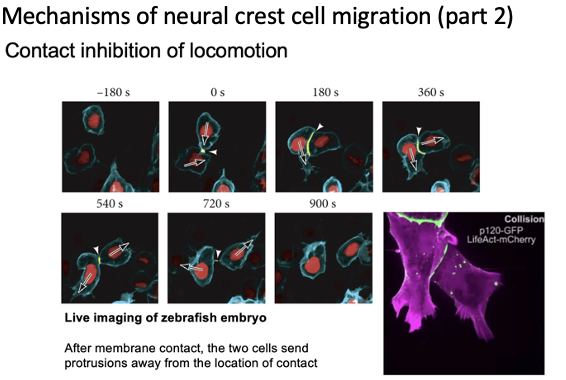 When neural crest cells contact one another, they experience contact inhibition, during which they will stop, turn, and migrate away in the opposite direction