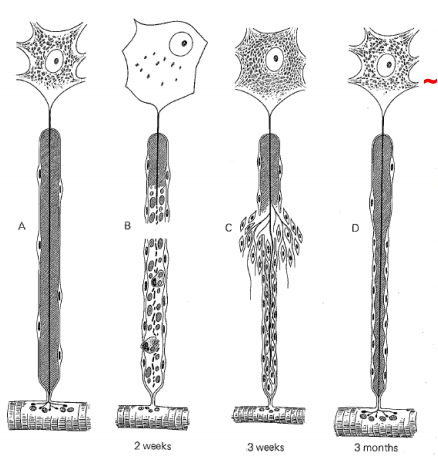 2 weeks post-injury: nucleus moves to the periphery, loss of Nissl substance, Wallerian degeneration, muscle fibre atrophy