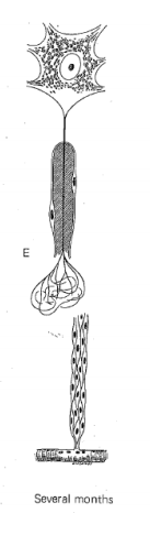 3 weeks post injury: Schwann cells proliferate, nucleus moves centrally, growing axons penetrate Schwann cell cord, muscle fibre atrophy