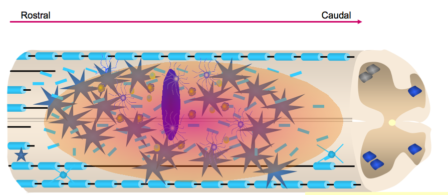 Days/weeks: axonal degeneration, demyelination, apoptosis, astrocytic gliosis and glial scar, cavity formation