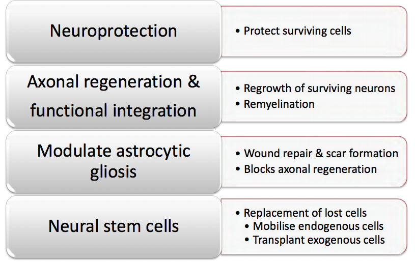 Inhibit growth blocking factors: astrocytic gliosis and glial scar, myelin inhibitors, developmental guidance molecules