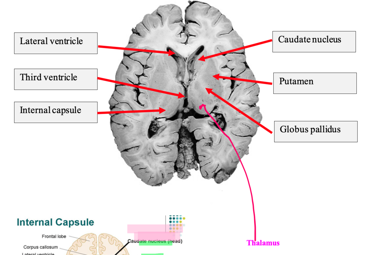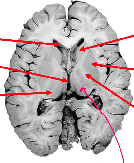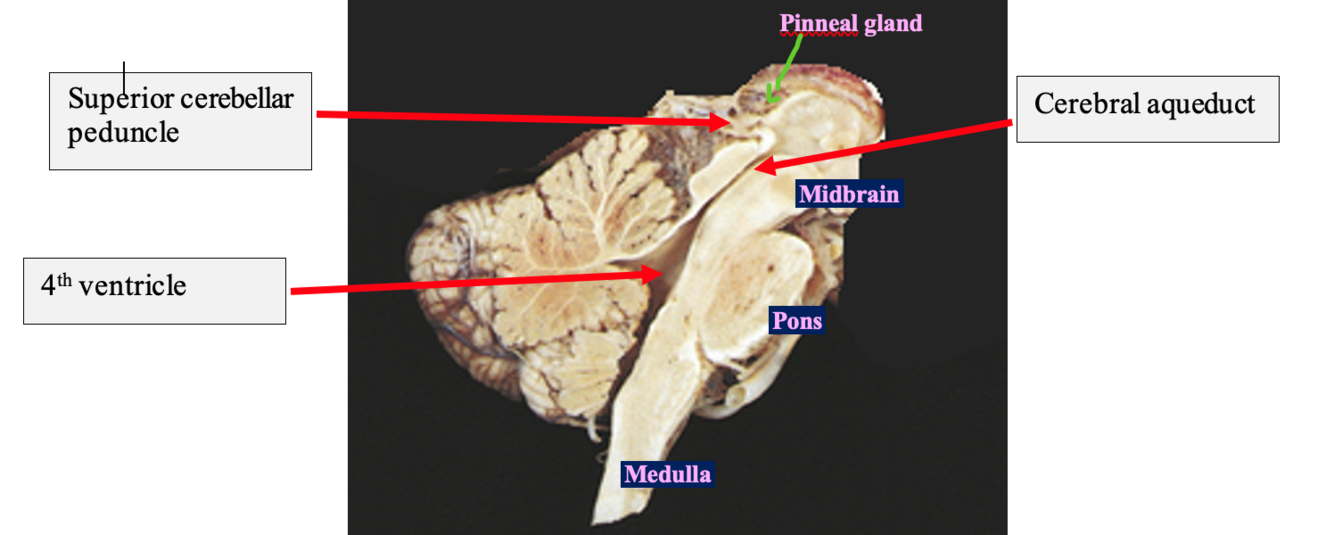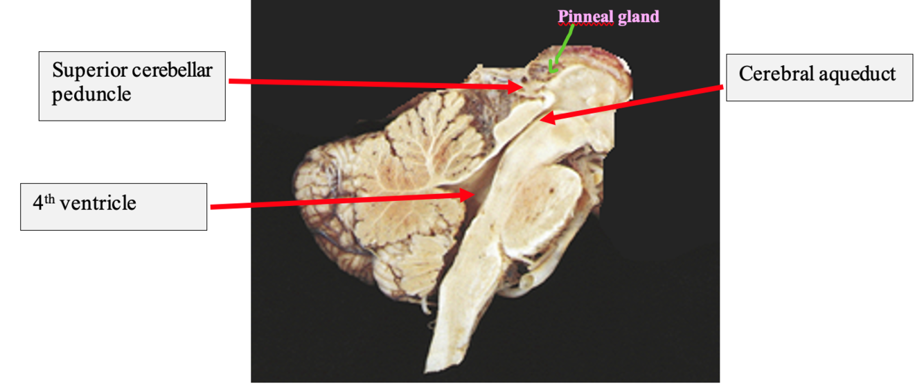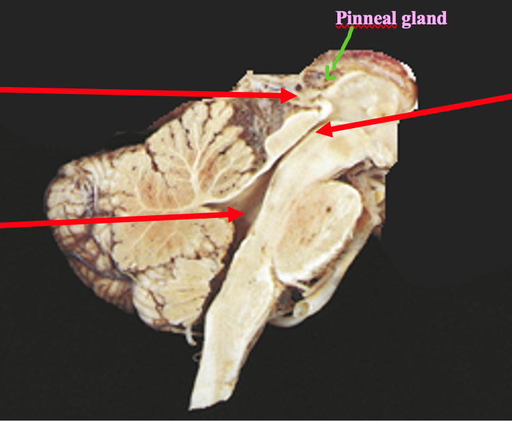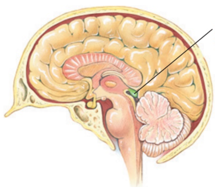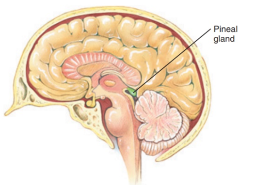 The pinneal gland- part of the epithalamus, posterior to the thalamus