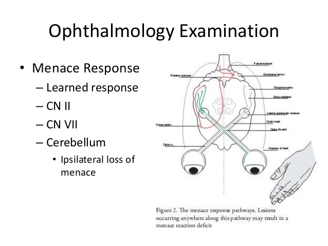 Test: Menace response; palpebral reflex; lip retraction; ear movement; Schirmer tear test