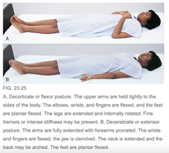 Decorticate Associated w/ injury to the corticospinal tracts above the brainstem.