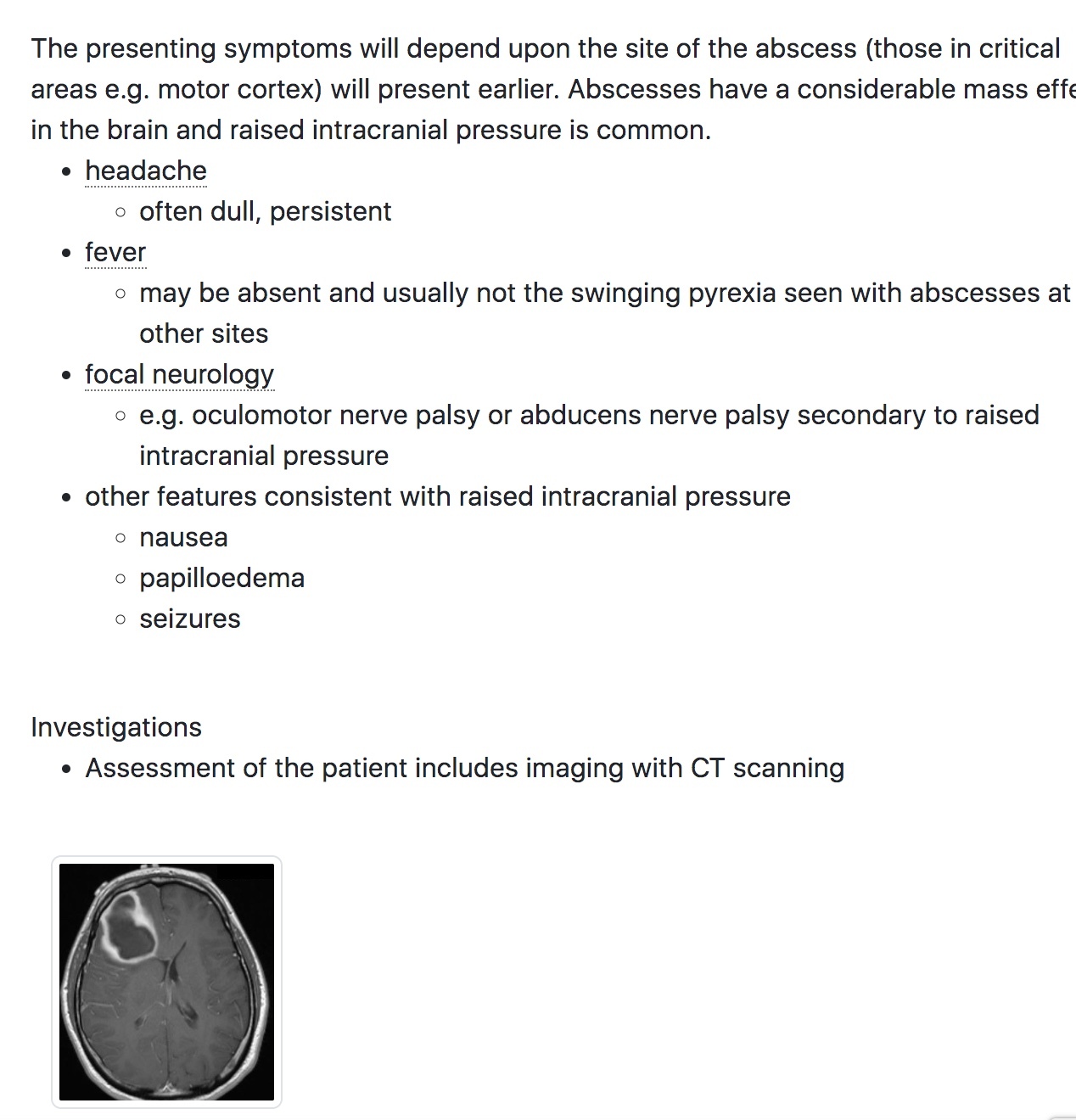 brain abscess features and investigations