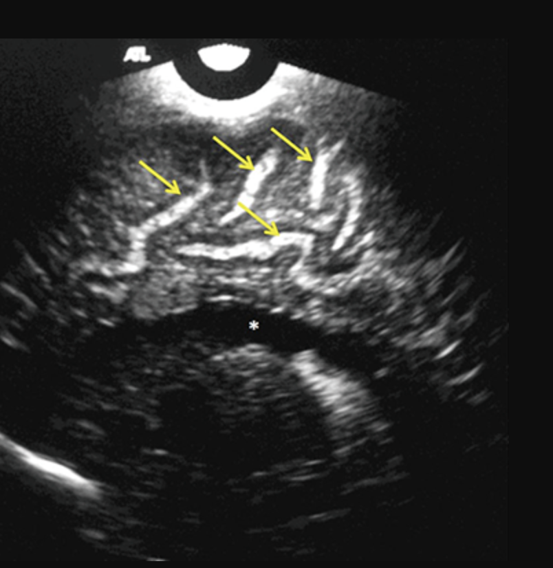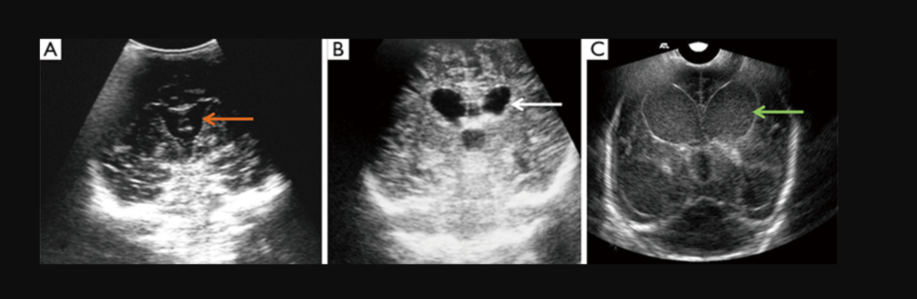 The dilated median prosencephalic vein (MPV) appears as an anechoic structure in the midline posteriorly and demonstrates prominent flow on Doppler examination. Shunting may lead to complications such as hydrops fetalis or fetal cardiomegaly.