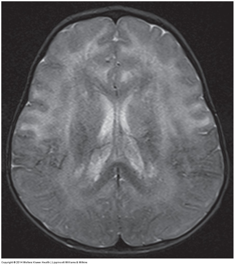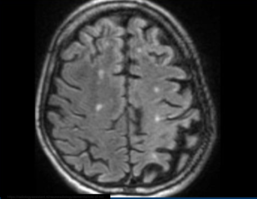 MRI shows asymmetric parietal cortical atrophy, sometimes with associated hyperintensity of the white matter on T2W images.