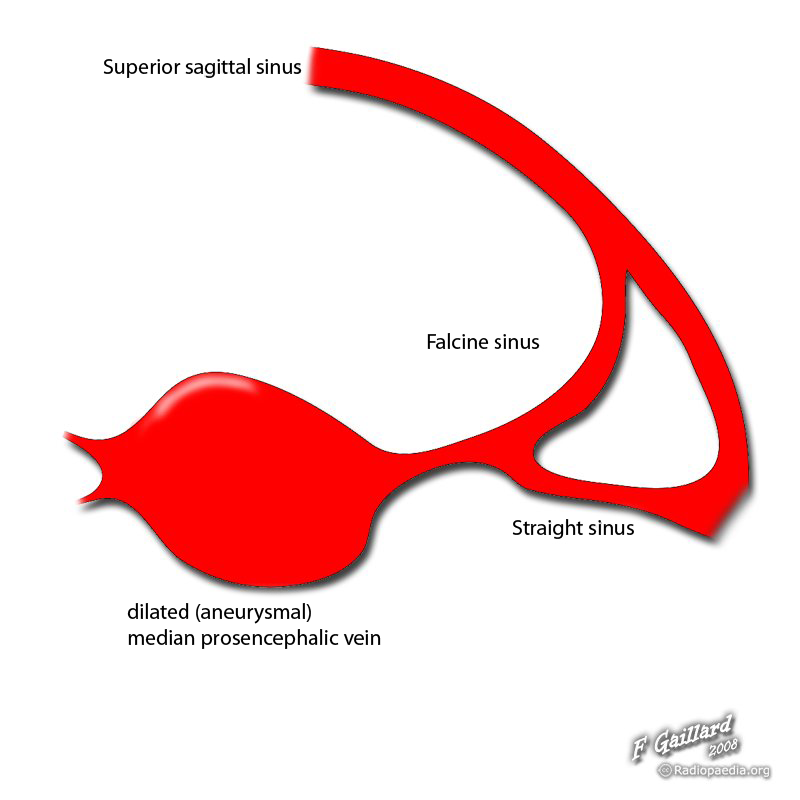 The anomaly is actually due to a cerebral arteriovenous fistula of the median prosencephalic vein (MPV) (a precursor of the vein of Galen) occurring at 6-11 weeks gestation and not a malformation (no nidus present). The MPV fails to regress and becomes aneurysmal. It drains via the straight sinus (present only in 50%) or a persistent falcine sinus, and the vein of Galen does not form.