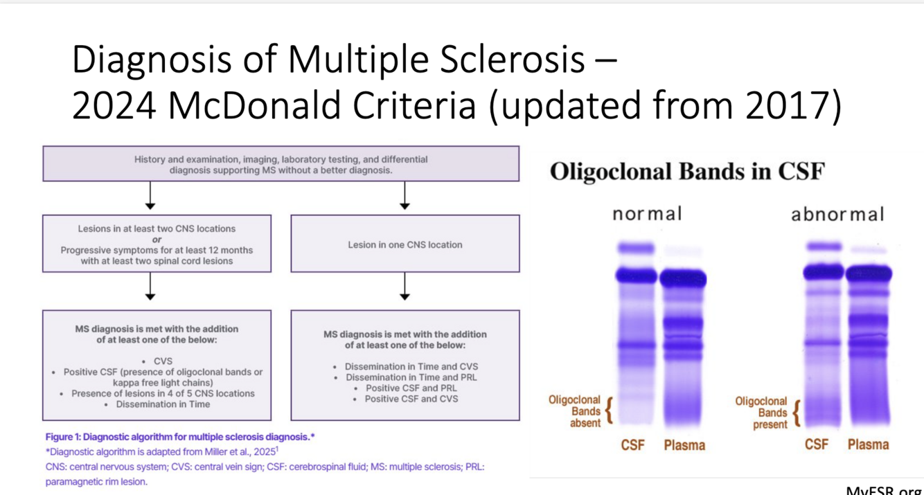 CNS Location for dissemination in space: optic nerve, periventricular, juxtacortical/cortical, infratentorial, spinal cord