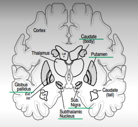 The nuclei of the basal ganglia are named in accordance with shape, location or shape formed when grouped together: