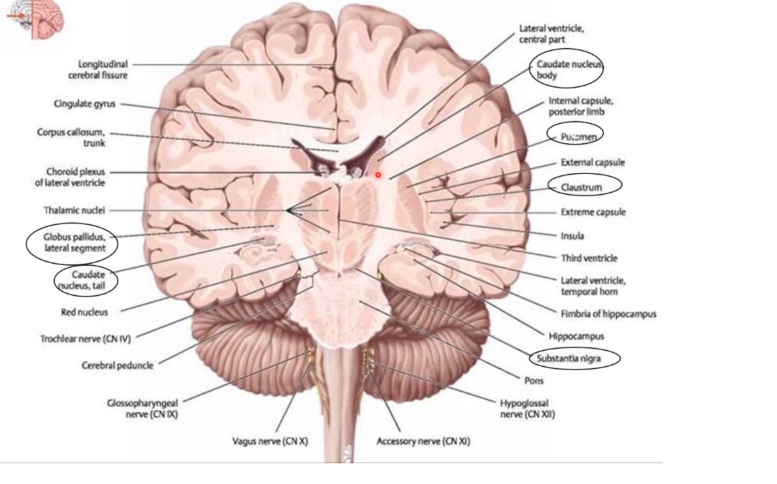Corpus striatum = caudate nucleus + putamen + globus pallidus