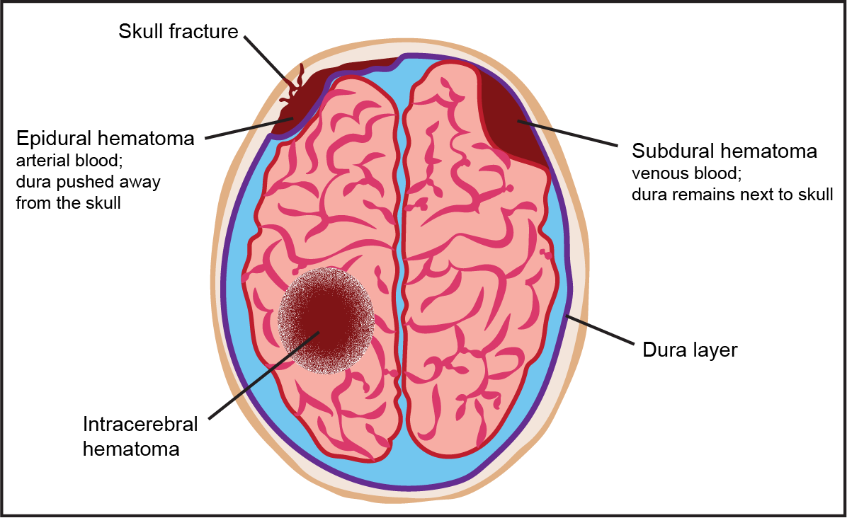 The most serious bleeding head injury. It occurs above the dura and is arterial blood (bleeds fast).