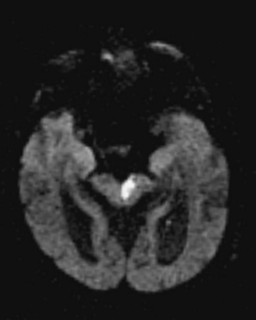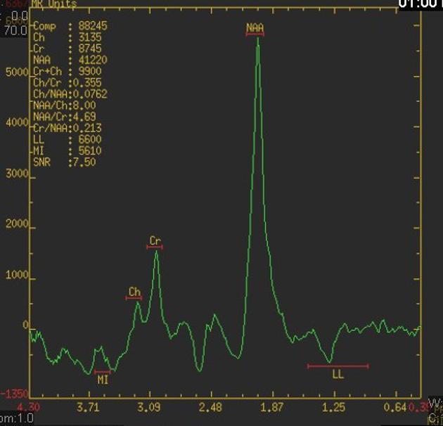 Paciente de 2 anos de idade, apresentando atraso global do desenvolvimento e macrocefalia. É descrito hipersinal difuso em T2 na substância branca. Com o seguinte resultado na espectroscopia, qual a principal alteração e a mais provável hipótese diagnóstica?