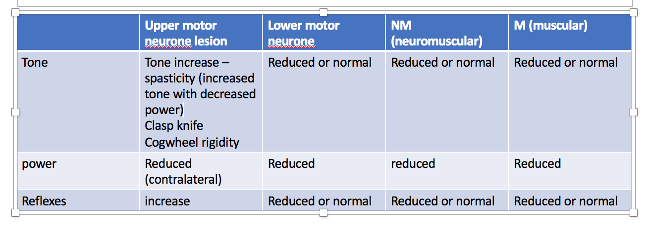 tone normal power decreased majority of reflexes reduced therefore: LMN, neuromuscular or muscular sensory problems (due to pinprick impaired, vibration sensation reduced) therefore not muscular problem or neuromuscular problem –> LMN lesion (peripheral neuropathy)