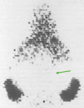 Canine, dorsal scan, area of increased uptake in cerebellar and medulla oblongata area