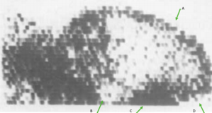 Species, abnormalities? What are the two ovoid regions of high activity? Assuming you can see the faint x region of activity labeled, name it.