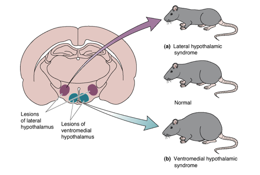 What happens to the body weight of a mouse in which its lateral hypothalamus is lesioned? What does this show?