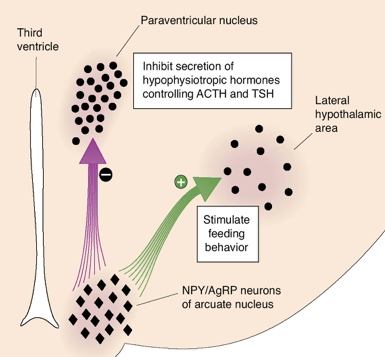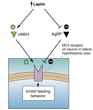 Explain how elevated leptin levels in the body cause inhibition of feeding behaviour (stop eating)?