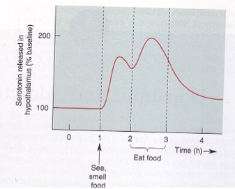 What happens to serotonin levels in the hypothalamus before and during feeding?