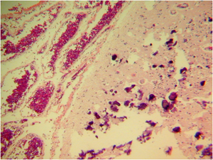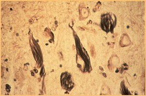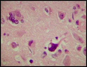 Below: measles virus inclusions within neuron