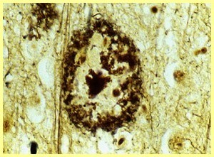 Loss of pigmented dopaminergic cell in the substantia nigra pars compacta and the formation of Lewy bodies in the brainstem.