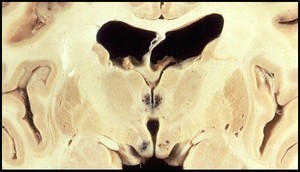 A 75 year old man begins to develop tremors and his wife notices that he seems to walk slower around the house. On neurological exam her demonstrates slower movements and writes in smaller handwriting than normal. Based on the gross speciment below, what would his diagnosis be?