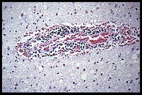 characterized by astrogliosis of gray and white matter, myelin loss, perivascular lymphocytes and a protracted course