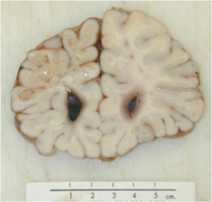 Gross: brain blood vessel abnormalities–> calcification–> brain changes (occured UNDER port wine stain