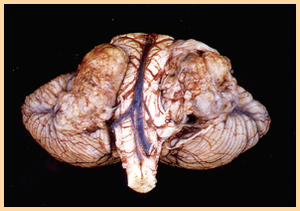 Symptoms: gradual, progressive psychoneurological deterioration, consisting of personality change, seizures, myoclonus, ataxia, photosensitivity, ocular abnormalities, spasticity, and coma.