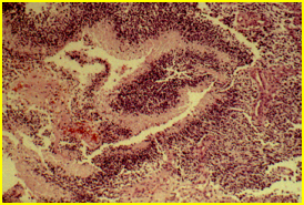 Below: vascular proliferation driven by VEGF= diagnostic feature in glioblastoma