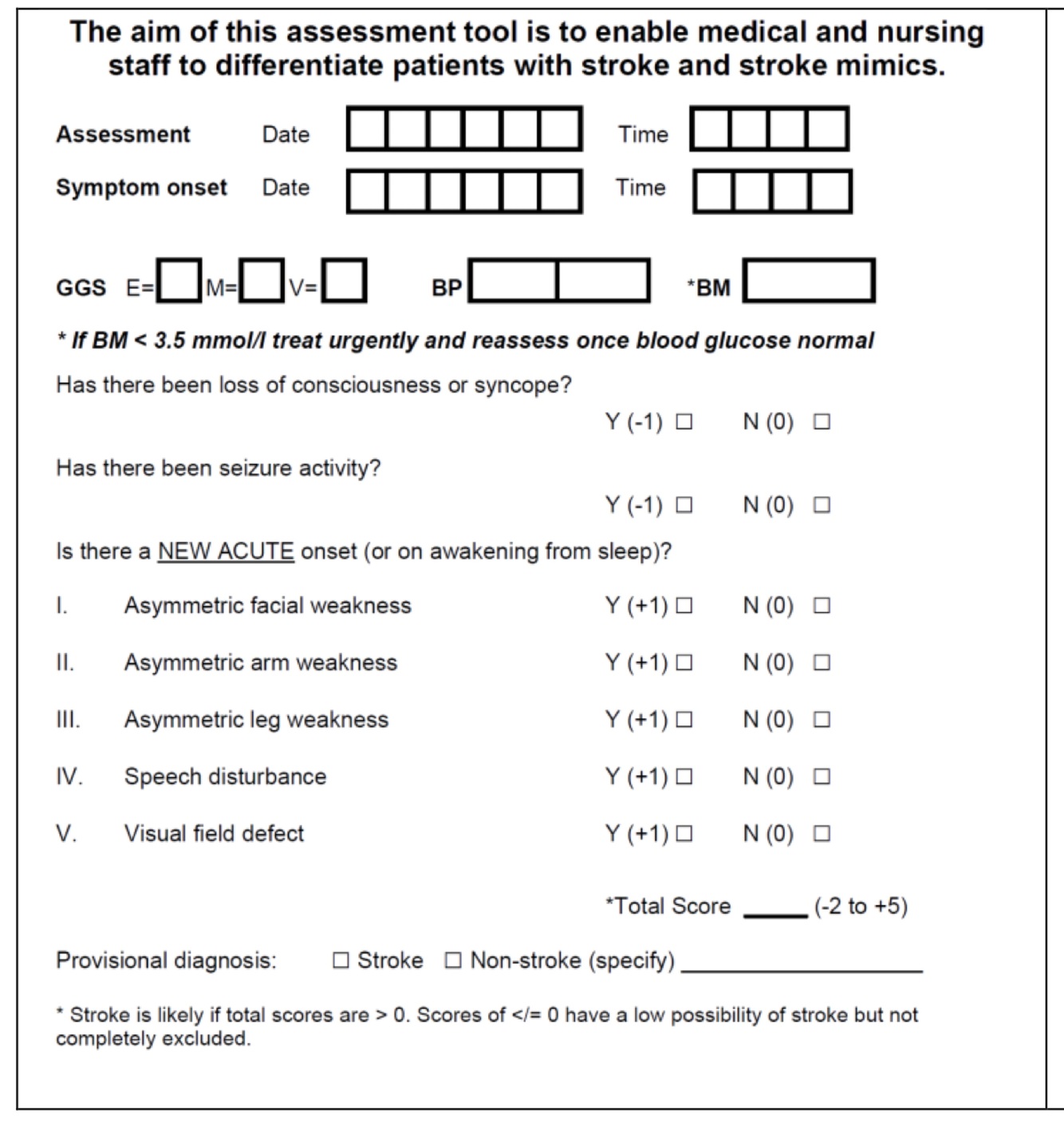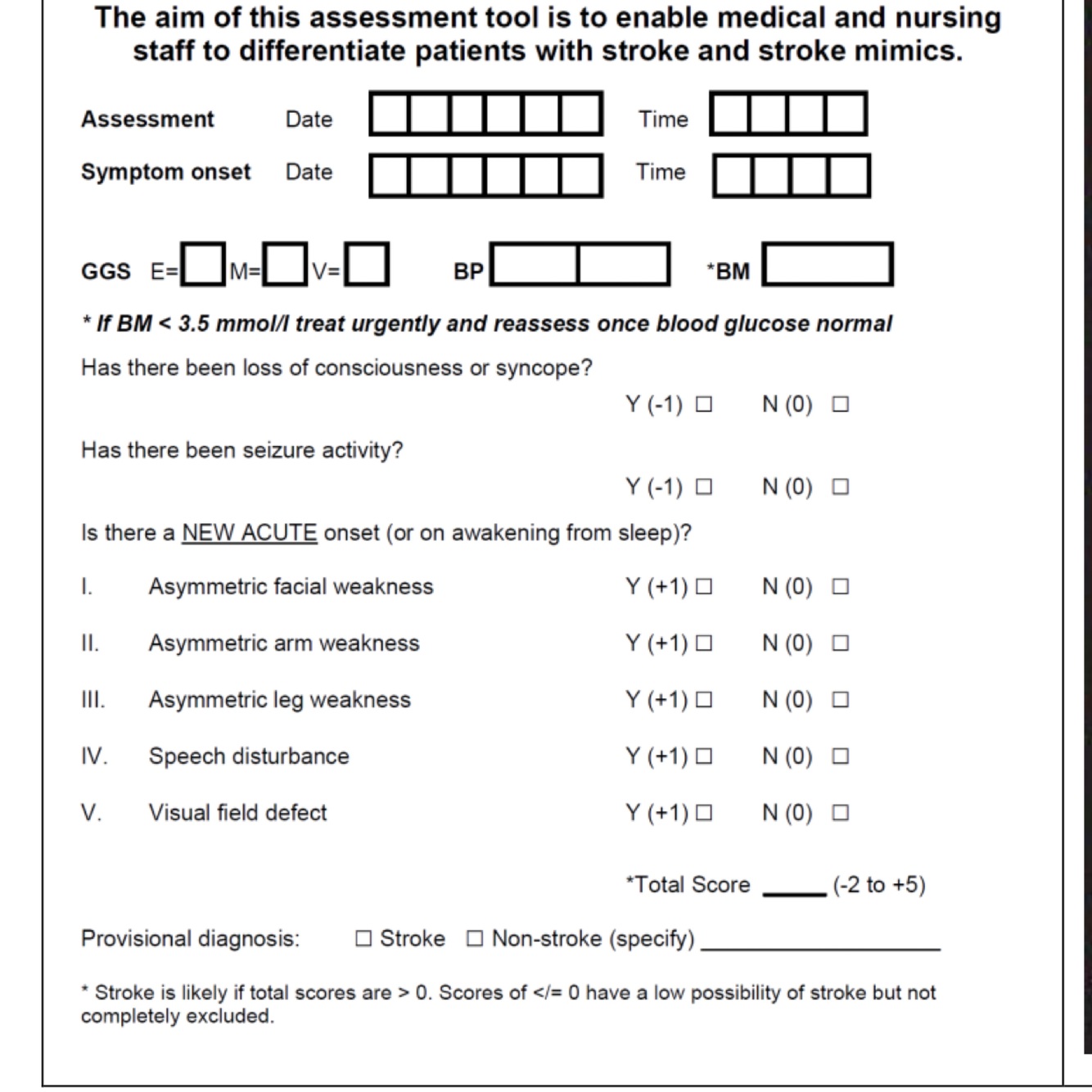 What tool is used in A&E to identify stroke and what score indicates stroke is likely