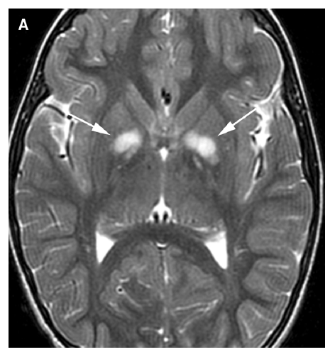 Increased ADC signal T2 hyperintensity in brainstem, cerebellum, thalamus, internal capsule, CC but spares subcortical white matter and centrum semiovale