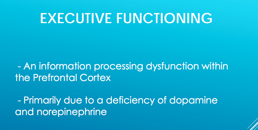 ADHD is an information processing dysfunction where in the brain; primarily due to deficinecy of which 2 NT’s?