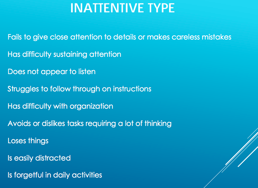 According to the DSM-5 what are 9 sx’s of the inattentive type of ADHD?