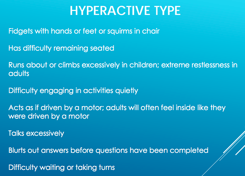 According to the DSM-5 what are the sx’s that fit the hyperactive type of of ADHD?