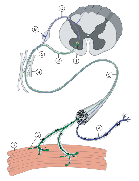 (A - sensory nerve fibre, B -spinal ganglion, C - Dorsal nerve root)