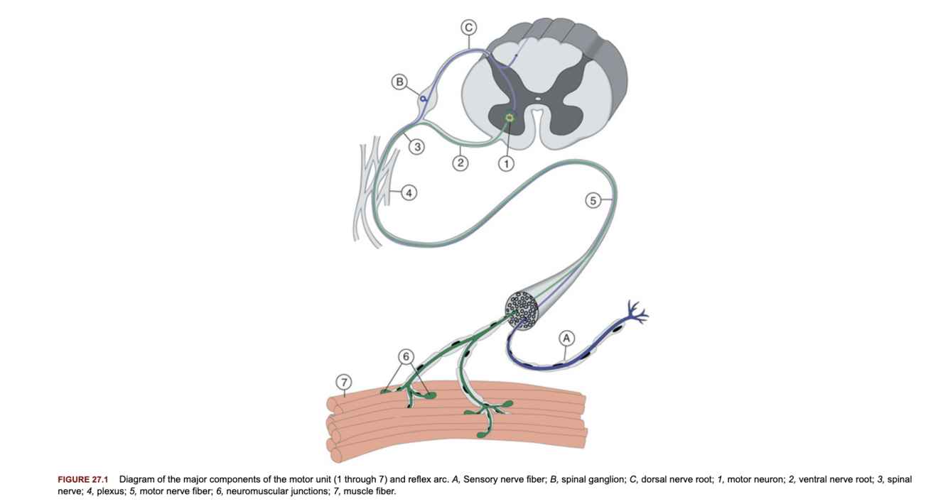 Motor unit, intrafasicular nerve branches, NMJ, myofibers, supportive connective tissue, vascular tissues.