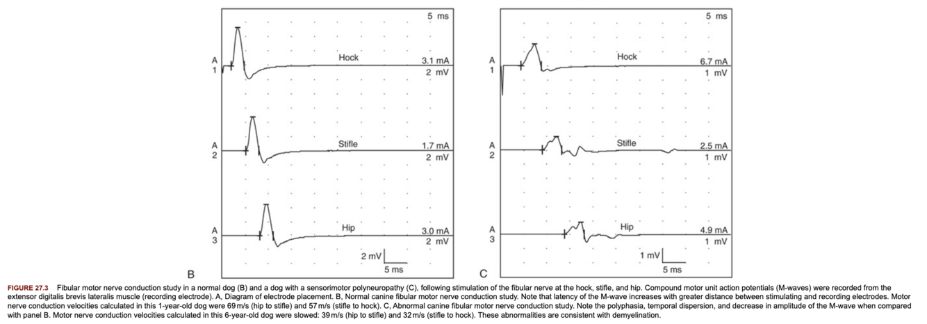 Polyphasia of M-waves, extreme slowing of conduction velocity