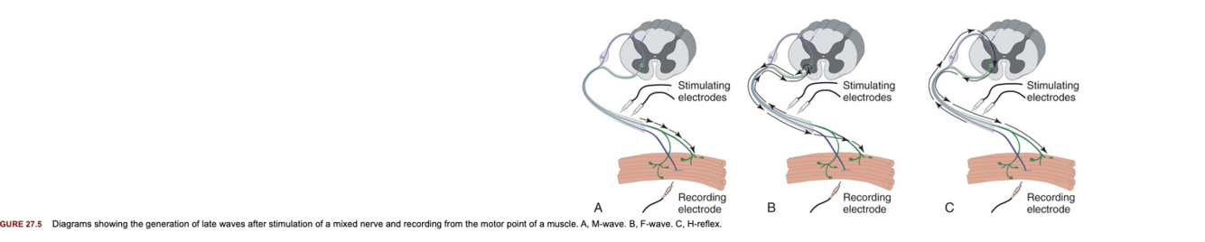 F-waves: antidromic propagation of action potentials along the motor nerve, to the ventral gray column of the spinal cord, and then back again.
