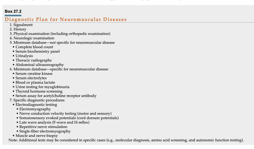 Describe a diagnostic plan for the work-up of neuromuscular diseases