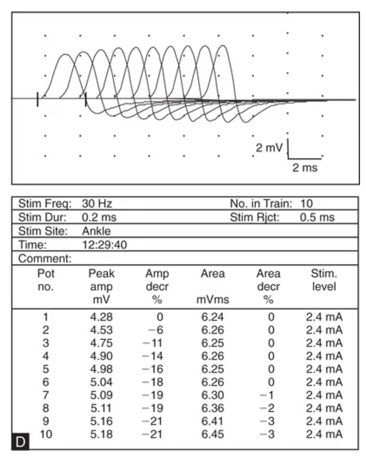 Stimulated single fiber electromyography: assesses neuromuscular ‘jitter’ following repeated stimulation with a concentric needle electrode. Increased jitter is consistent with subtle pathologic changes at the NMJ (such as with myasthenia gravis)