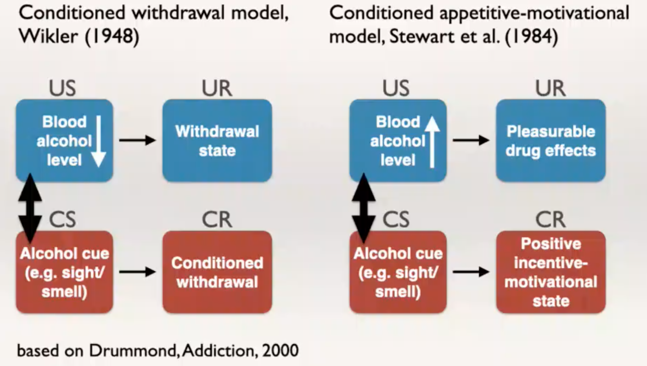 The conditioned withdrawal model argues that during drining, the drink is associated with induces withdrawal state, a drop in blood alcohol level (bad state). Next time n see cue e.g., bottle the cue will induce the withdrawal state (bad).
