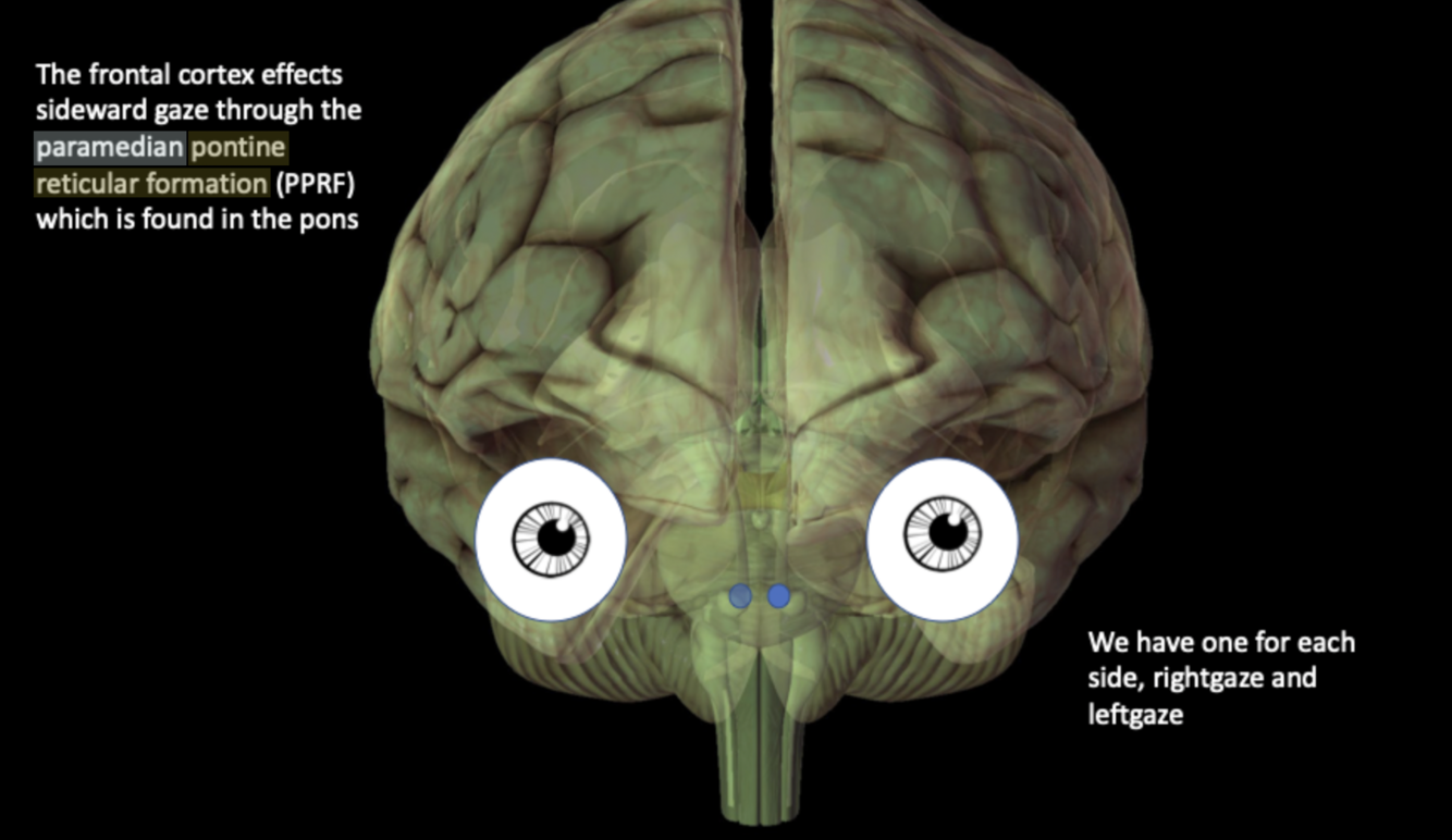 Voluntary gaze is initiated in the frontal eye fields and mediated by the paramedian pontine reticular formation (PPRF) in the pons, coordinating lateral gaze