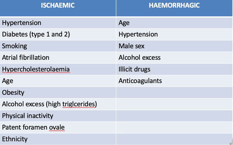 Risk factors differ slightly for ischaemic vs haemorrhagic stroke. Give some risk factors for each: