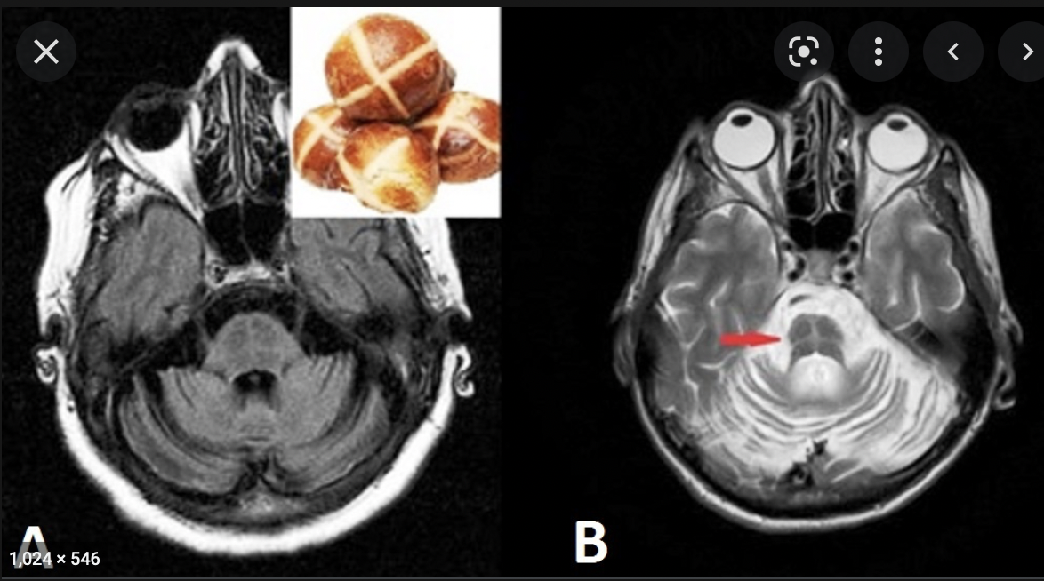 mulTi-sysTem aTrophy = T similar to Hot Cross Bun sign