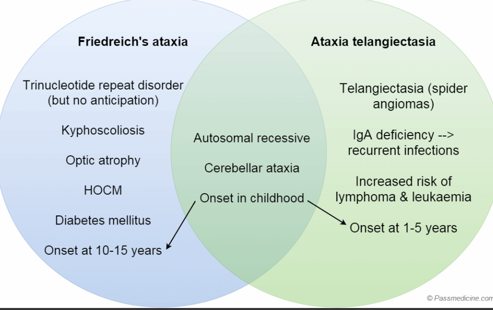 Compare and contrast Freidrichs ataxia and ataxia telangitasia?